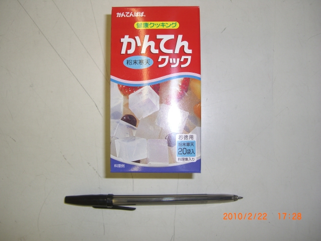 【かんてんクック】 スティック寒天4gX20本入り ¥1337,− 水500mlと本品一本(4g)を溶かし 2分程沸騰させお好みで砂糖などを 加え型に入れ、フルーツなどを入れて 冷蔵庫で冷やせば美味しいフルーツ 寒天の完成です!! ⇒ いろんなお料理のレシピも入ってます。 (有)マルセン