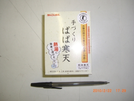 【手づくりぱぱ寒天】 粉末スティック寒天2gX10本入り¥448,− 本品一本(2g)を300mlの熱湯(80℃以上) で溶かして型に入れ、冷蔵庫で冷やせば完成。 色々な使い方のレシピも入ってます。 ⇒洗ったお米3合に本品一本(2g)を入れて炊く。 ご飯に入れて炊くとつやが良くなり、新米の様に なり、繊維も多くなりダイエットに良いと評判です。 (有)マルセン