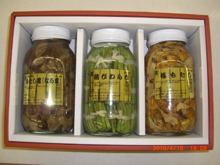 オリジナルきのこ水煮ギフト ¥3309,− ↓(なら茸900ml・結びわらび400g・桜もたし450g) ![]() |