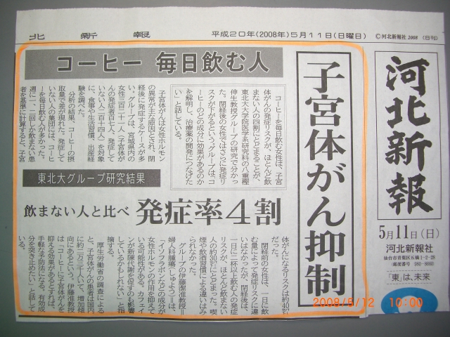なんと、コーヒーは「ガン」を抑制する? 今、新聞やテレビで大変話題になっているのである。東北大医学部などの実験の結果、子宮体がんの抑制効果が ハッキリと証明された。以前、ロイター通信でも大腸ガンの抑制に効果があると報じられ大変話題になった。 どうせ飲むなら香りの良いコーヒーを!! (有)マルセン